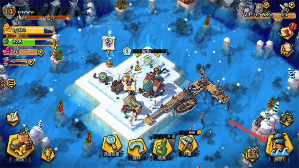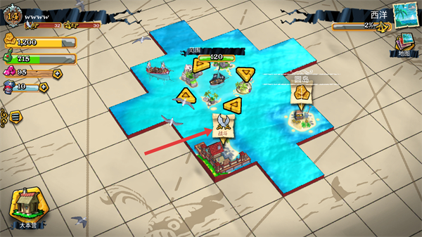 2、在地图界面,选择目标岛屿,点击【战斗】前往该岛屿,准备开展掠夺或探索行动。