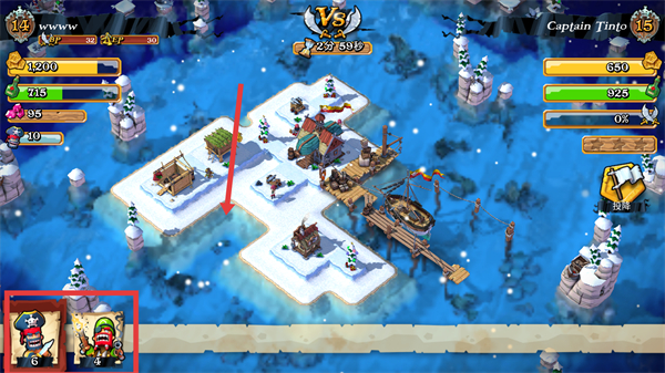 3、进入对战界面后,派遣底部的海盗角色,向敌方领地的建筑发起攻击,推进掠夺进度。