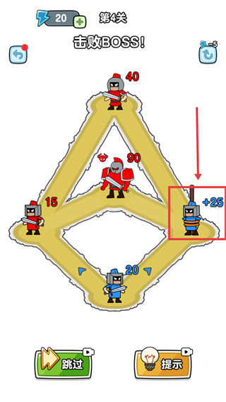 1、在关卡中,先选择带【+25】数值的角色,通过路径合并提升战力。