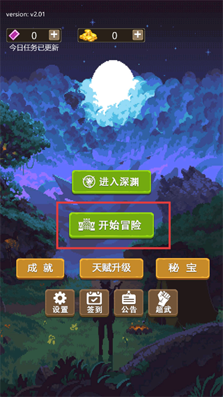 1、进入游戏后,点击【开始冒险】按钮,进入英雄选择界面。