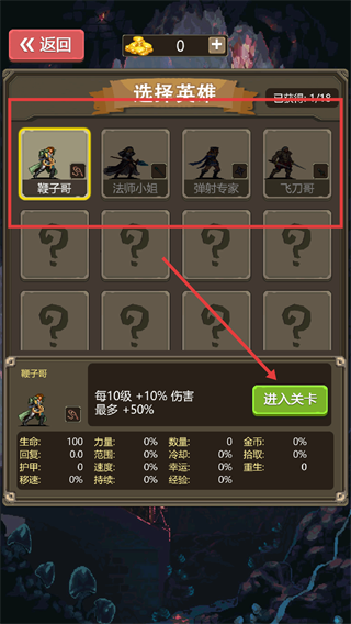 2、在【选择英雄】界面,选定初始英雄,查看其属性后点击【进入关卡】开启冒险。