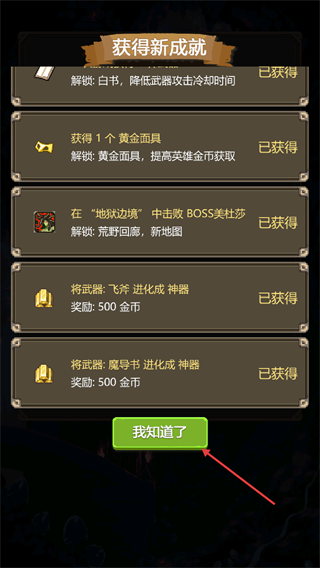 4、达成成就条件后,会弹出【获得新成就】界面,点击【我知道了】继续冒险并积累奖励。