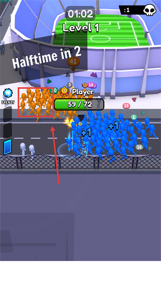 2、遇到敌方人群时,优先通过碰撞敌方获取【+1】人数,推进【59/72】进度以达成目标。