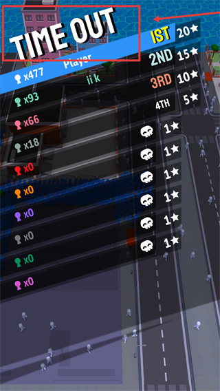 4、【TIME-OUT】结算时,根据星级排名(如【1ST-20★】)查看收益,积累资源用于后续关卡。