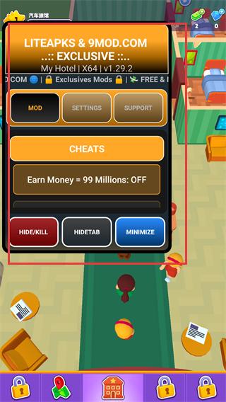 1、在功能界面可通过【CHEATS】等选项调整设置,也可操作【MINIMIZE】收起界面,回到酒店场景继续推进任务。