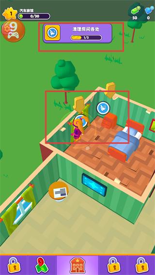 2、推进【清理-房间-各处】任务,按【2/3】进度要求,操控角色清理客房内的目标区域,积累任务进度。