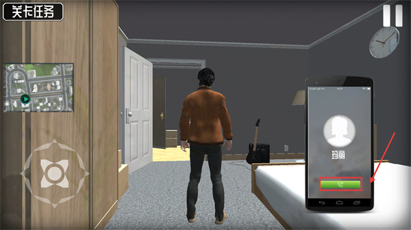 2、在室内场景中,点击手机界面的通话按钮与【玛丽】互动,这是推进【关卡任务】的关键步骤。