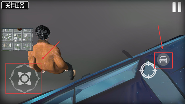 3、触发载具交互时,点击【汽车图标】切换到载具操控模式,同时用移动按钮调整角色位置。