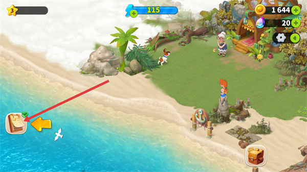1、点击界面中的笔记本图标,可查看当前任务进度,同时留意能量、金币等资源状态,推进游戏流程。