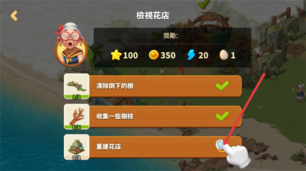 3、在【检查花店】的任务栏里,点击【重建花店】对应的按钮,推进该任务的后续流程,向完成目标靠近。
