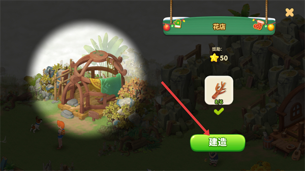 4、在【花店】建造界面,确认收集【枝条】材料充足后,点击【建造】按钮,完成花店重建并获取对应奖励。