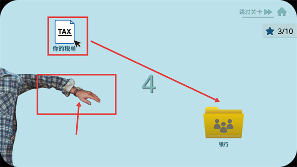 2、进入关卡后,操作红色框选的手臂区域,将代表税单的文件向“银行”对应的目标区域投掷,推进甩锅流程。
