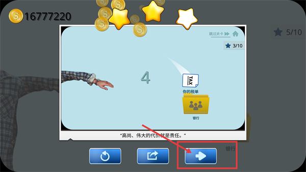 4、完成本关后,点击红色框选的箭头按钮,领取奖励并进入下一关,继续参与甩锅模拟器的游玩。