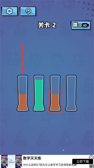 3、后续把另一色液体(如棕色液体)集中到对应试管,完成同色液体的归类,接近通关条件。