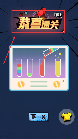 4、看到【恭喜通关】提示后,点击【下一关】按钮,可进入新关卡继续挑战液体分类。