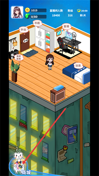 1、在主播房间点击左下角【商场】为角色购买服饰、外设等增加角色人气。