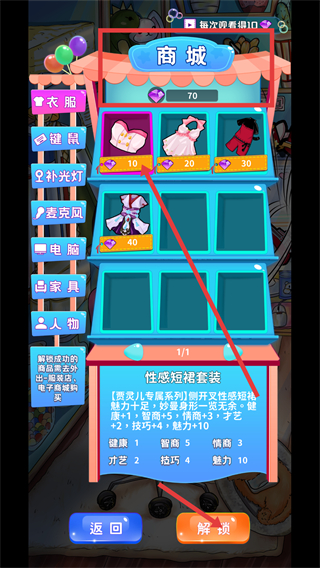2、进入商城解锁【性感短裙套装】,消耗10钻石提升魅力值,增强直播吸引力增加粉丝关注。