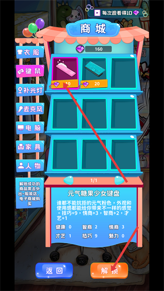 3、在商城解锁【元气糖果少女键盘】,消耗10钻石提升元气值,让直播效果更生动吸引观众。