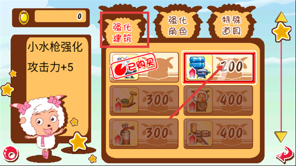 2、进入商店后选择【强化建筑】分类,可购买如小水枪强化的道具,这类道具能提升建筑的攻击力等属性。