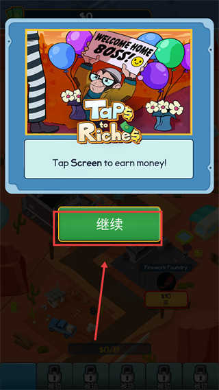 1、在【Tap-to-Riches】中,点击【继续】进入游戏,通过点击屏幕获取金钱,开启财富积累流程。
