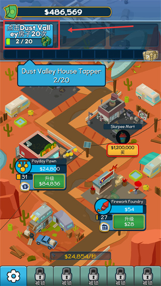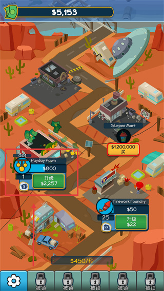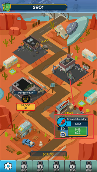 2、解锁【Firework-Foundry】后,消耗$22进行升级,可提升每秒收益,加速财富增长。