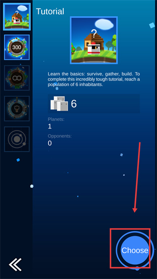2、【Tutorial】教程关需达成6人口目标,点击【Choose】进入教程,学习生存、收集与建造基础玩法。