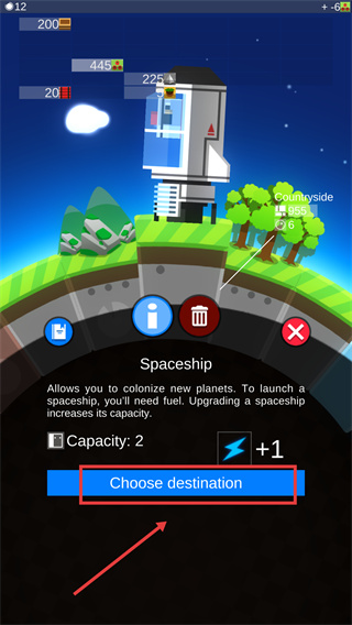 4、【Spaceship】用于殖民新星球,点击【Choose-destination】选择目标,需准备燃料以完成发射,升级可提升殖民容量。