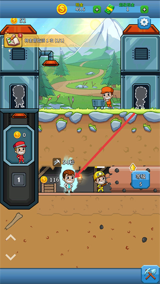 3、矿层内【主管】与【矿工】协作,主管提升效率,矿工挖矿积累金币助力矿山升级。
