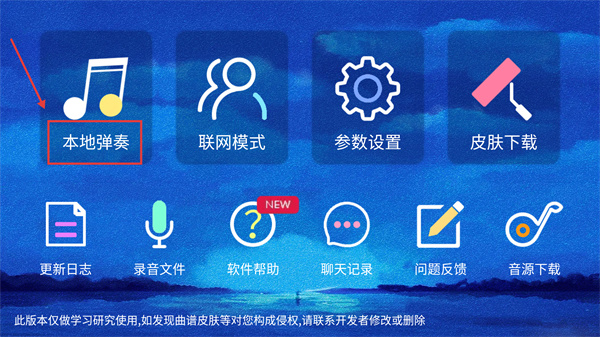 1、进入界面后选择【本地弹奏】模式,可体验离线曲谱演奏,也可通过其他功能调整设置或下载资源。