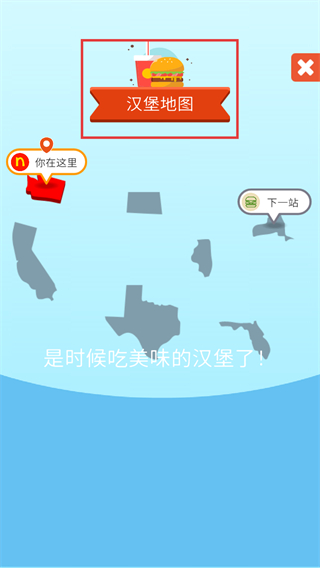 1、在【汉堡地图】界面确认当前位置,按提示前往下一站,推进店铺的区域拓展进度。