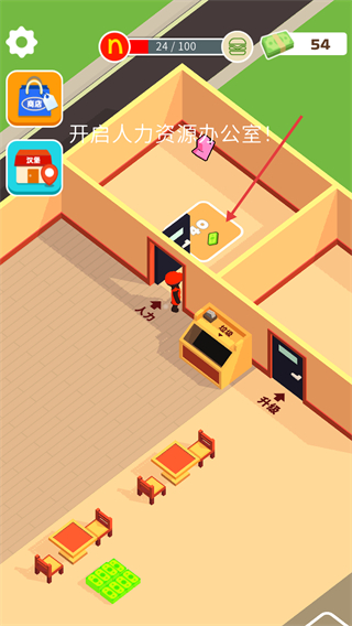 3、按提示点击指定区域,【开启人力资源办公室!】,解锁职员管理功能,为后续升级店铺做准备。
