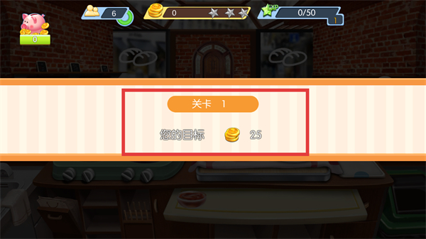 1、进入关卡1,目标赚取25金币,点击开始烹饪松饼,按步骤操作快速完成订单积累收益。