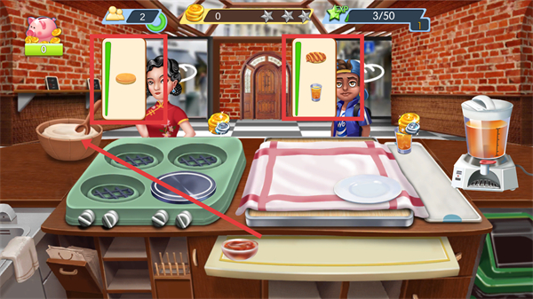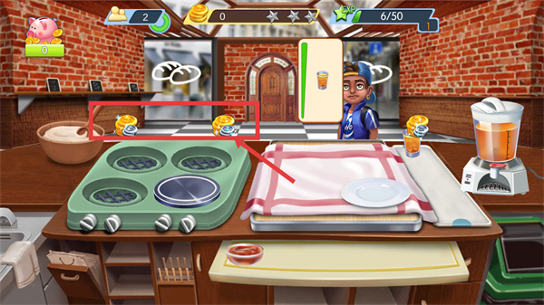 2、根据顾客需求,点击松饼面糊开始烤制,同时准备橙汁,按顺序完成顾客订单获取奖励。