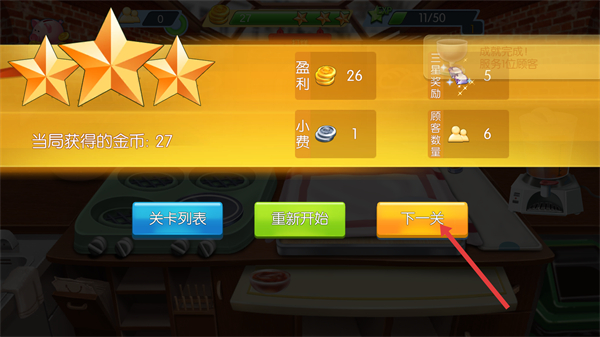 4、关卡结束后点击下一关,继续挑战更高难度,积累更多金币解锁新餐厅和世界各地美食。