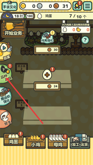 1、夜晚时点击【品种改良】按钮,消耗【铜币】解锁新鸡种,为后续提升鸡肉品质与收益打下基础。
