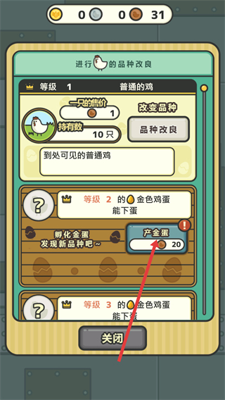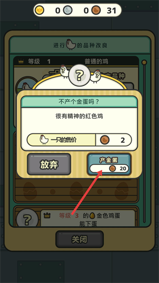 2、在品种改良界面选择【产金蛋】,消耗20铜币获取等级2的金色鸡蛋对应的鸡,提高单只售价。