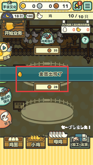 4、完成改良后金蛋出现,消耗铜币强化鸡窝,此时鸡数量满额,可准备开始日间业务。