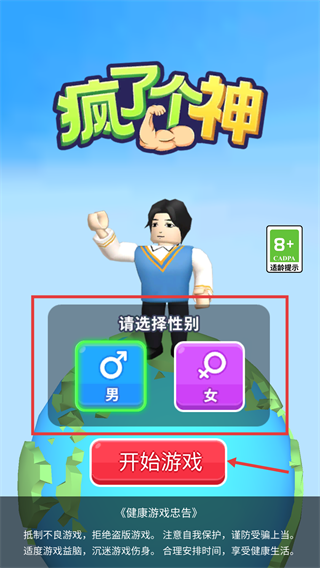 1、进入【疯了个神】界面,先选择【请选择性别-男/女】,确认后点击【开始游戏】,开启游戏进程。