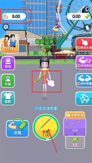 2、进入游戏后关注【8.00-肌肉值】,点击角色手持的【铅笔】完成【点击加速举重】操作,通过【铅笔-1.00】按钮积累肌肉值。