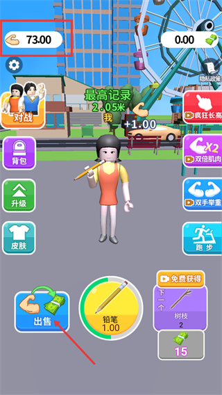 3、肌肉值累积至【73.00】后,点击界面的【出售】按钮兑换资源,同时关注【2.05米-最高记录】推进自身成长进度。