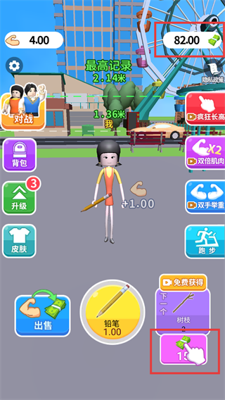 4、获得【82.00-金币】后,点击【15-金币按钮】获取资源,留意当前【4.00-肌肉值】,继续提升以刷新【2.14米-最高记录】。