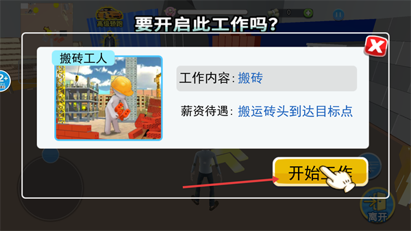 2、选择【搬砖工人】工种,确认工作内容与薪资待遇后,点击【开始工作】。