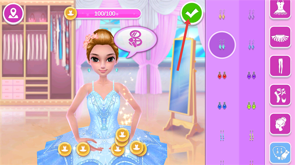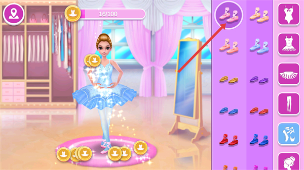 2、搭配【芭蕾舞鞋】与蓝色连衣裙,获取金币奖励,加快评分进度条的增长速度。