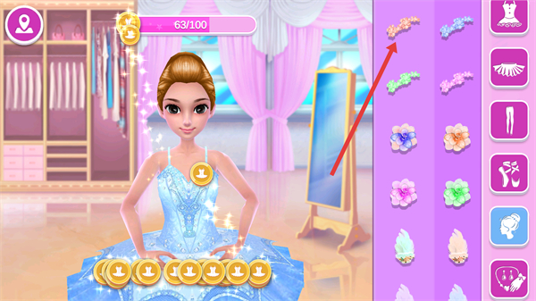 3、挑选【花朵】发饰装饰角色头部,增加装饰细节,将评分进度推进至63。