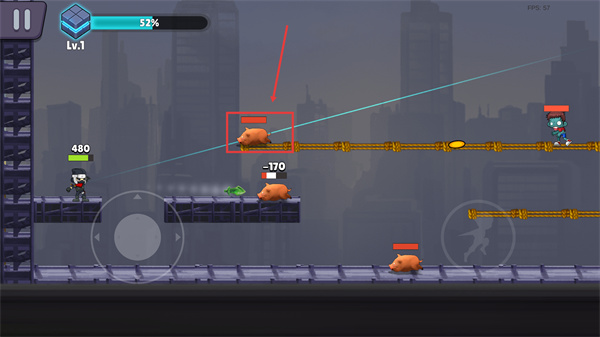 1、操控角色使用蓝色瞄准线攻击带红色小猪可造成【-170】伤害。