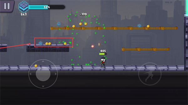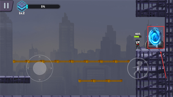 2、击败怪物后会掉落经验,注意拾取绳索平台上的金币和蓝色方块,利用跳跃躲避障碍。