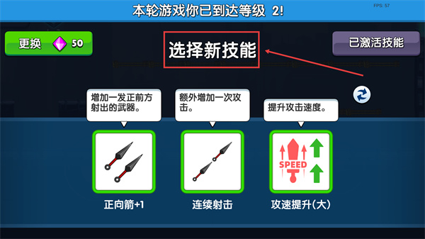 3、当角色升级到【Lv.2】时,会进入技能选择界面,从三个技能中选取一个。