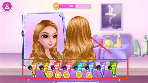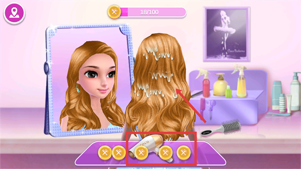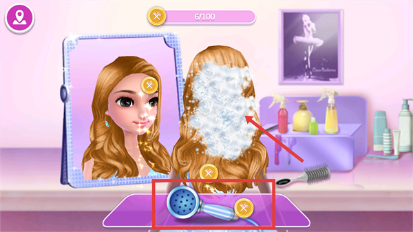 2、在美发界面中,先使用洗发泡沫清洁舞者头发,再点击下方工具冲洗干净,提升美发进度