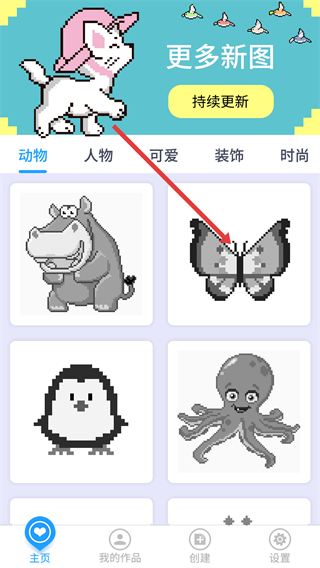 1、在主界面选择喜欢的图片分类,点击目标图片进入填色环节,开启你的像素艺术创作之旅。