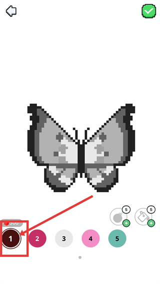 2、进入填色界面后,点击底部数字1对应的颜色,准备为蝴蝶图案的对应格子填色。